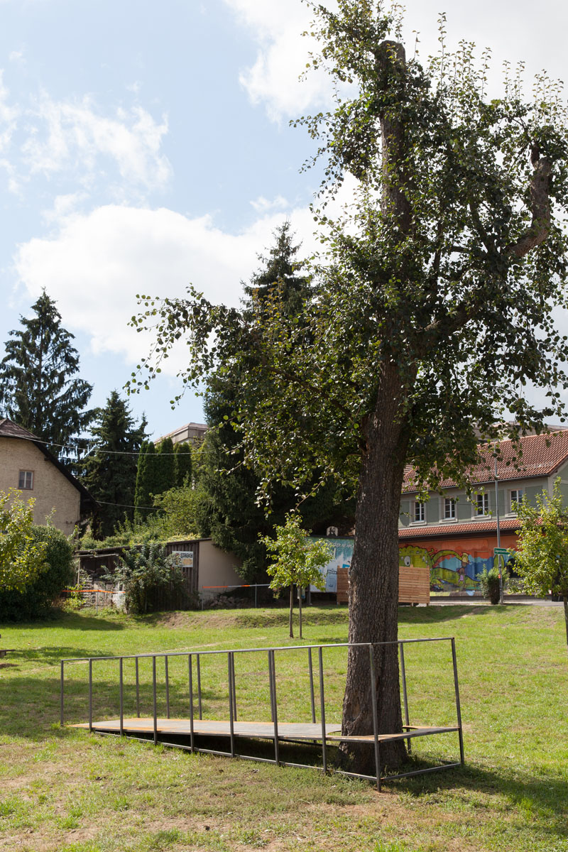 Als landschaftsplanerische Intervention installieren wir eine begehbare Rampe, an deren Ende ein Baum aus der „Lücke“ ragt und umschlossen wird.