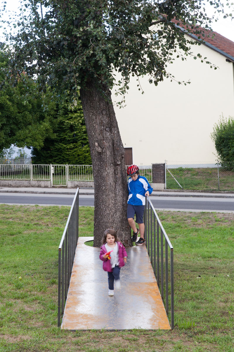 Als landschaftsplanerische Intervention installieren wir eine begehbare Rampe, an deren Ende ein Baum aus der „Lücke“ ragt und umschlossen wird.